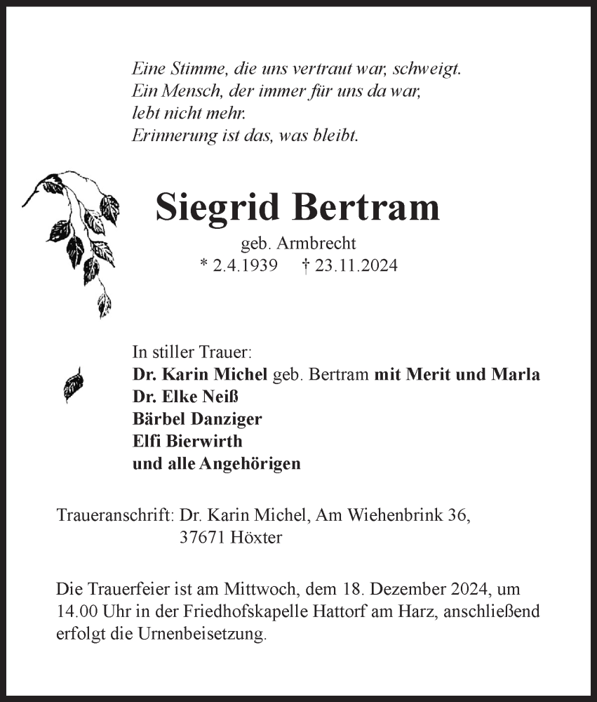 Hier finden Sie alle Traueranzeigen aus der Zeitung, die bisher für Siegrid Bertram erschienen sind. Weitere Traueranzeigen, die in der Zeitung erscheinen, werden hier ebenfalls aufgelistet