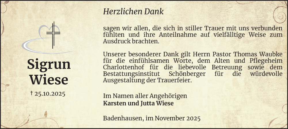 Hier finden Sie alle Traueranzeigen aus der Zeitung, die bisher für Sigrun Wiese erschienen sind. Weitere Traueranzeigen, die in der Zeitung erscheinen, werden hier ebenfalls aufgelistet