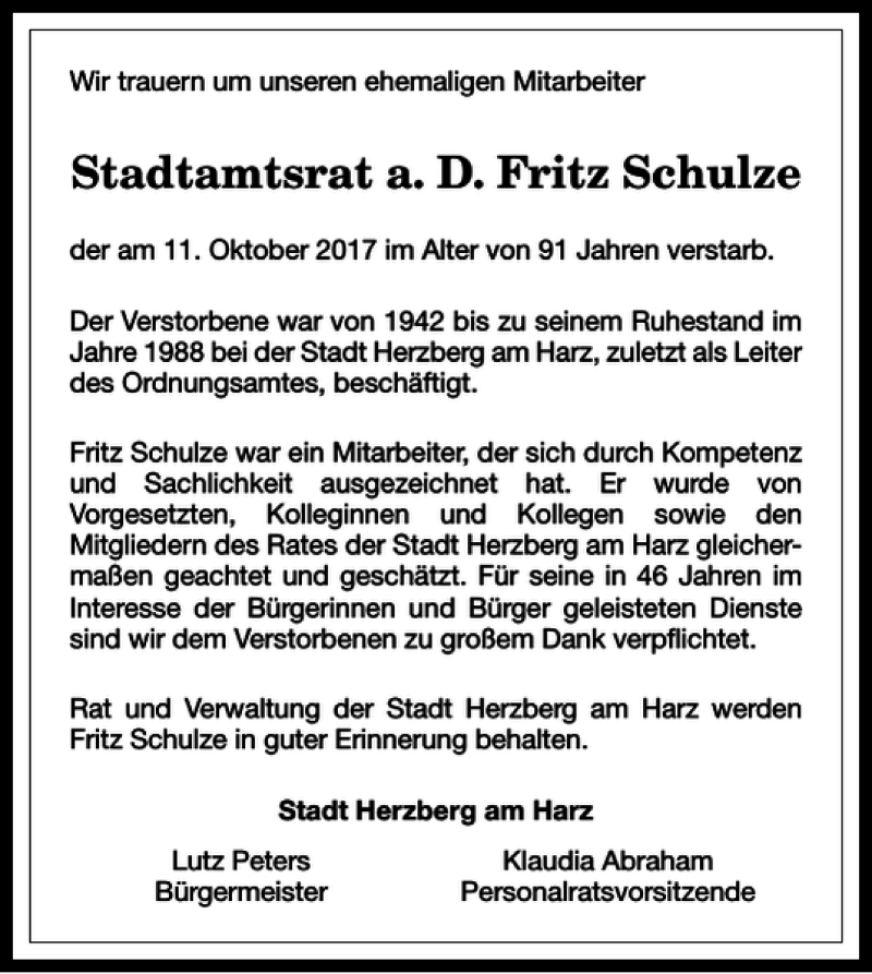 Hier finden Sie alle Traueranzeigen aus der Zeitung, die bisher für Stadtamtsrat a. D. Fritz Schulze erschienen sind. Weitere Traueranzeigen, die in der Zeitung erscheinen, werden hier ebenfalls aufgelistet