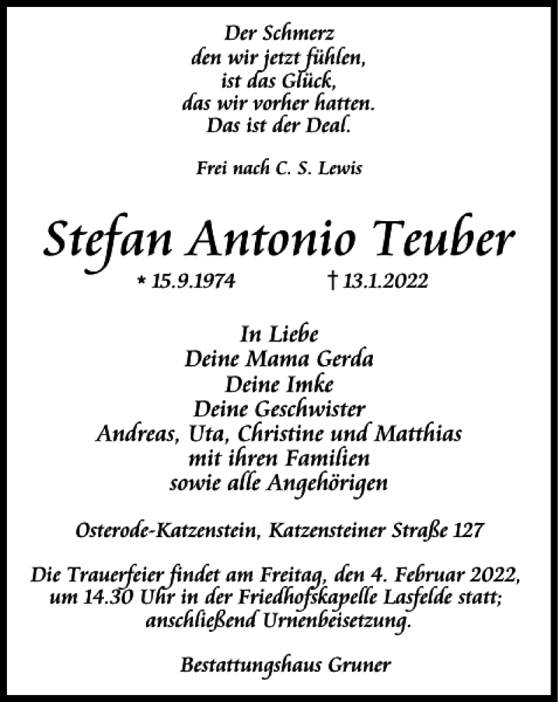 Hier finden Sie alle Traueranzeigen aus der Zeitung, die bisher für Stefan Antonio Teuber erschienen sind. Weitere Traueranzeigen, die in der Zeitung erscheinen, werden hier ebenfalls aufgelistet