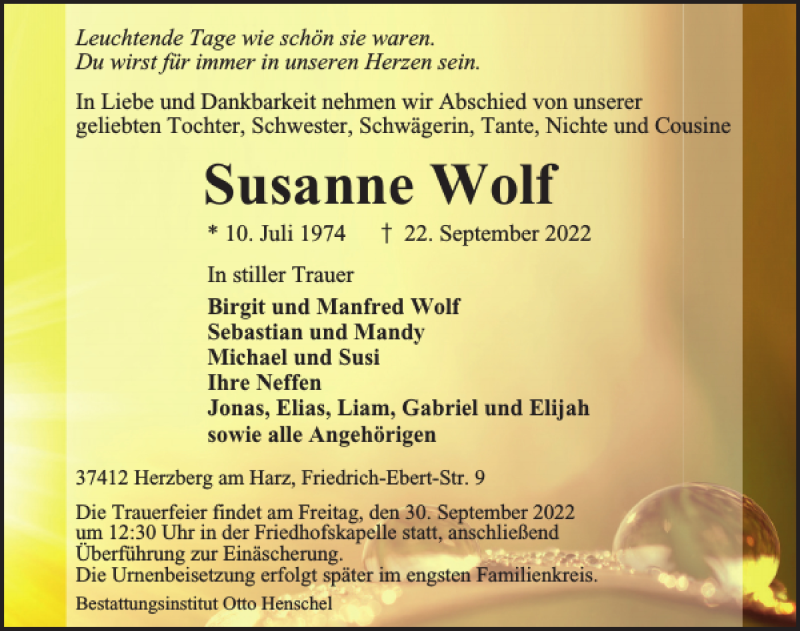 Hier finden Sie alle Traueranzeigen aus der Zeitung, die bisher für Susanne Wolf erschienen sind. Weitere Traueranzeigen, die in der Zeitung erscheinen, werden hier ebenfalls aufgelistet