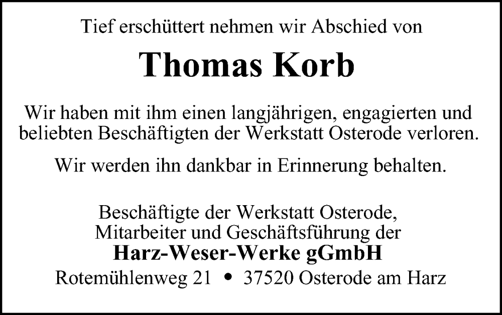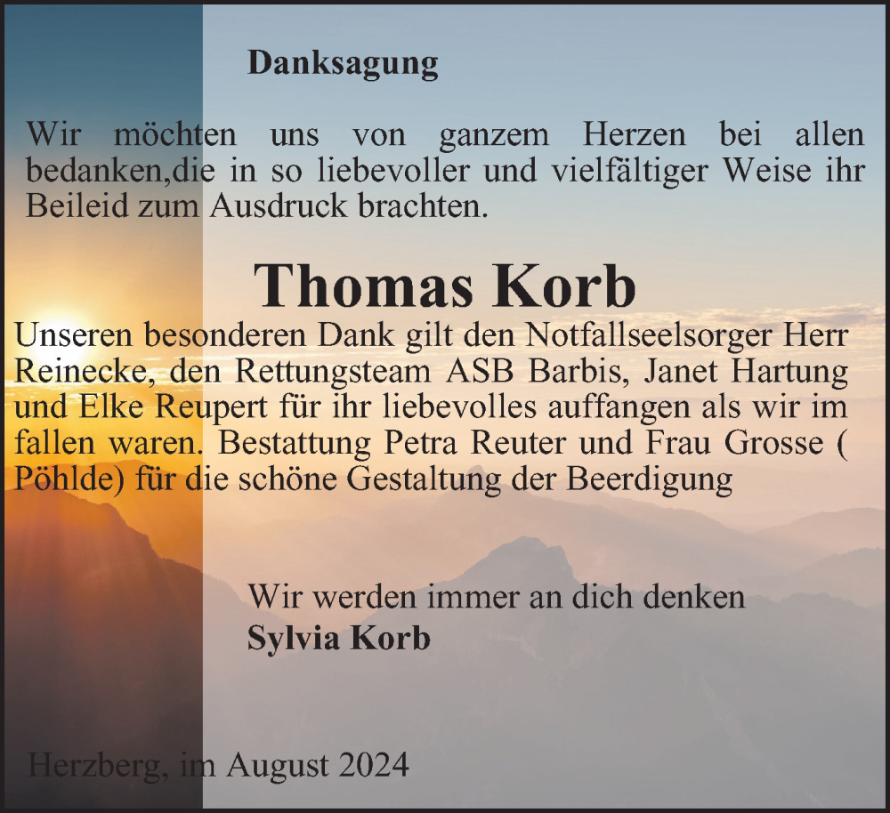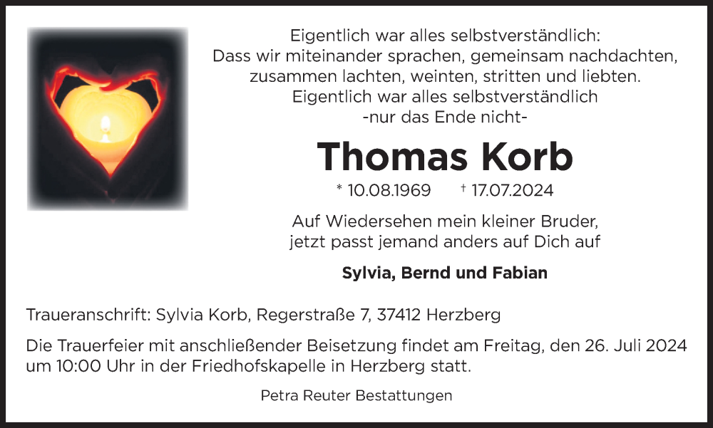 Hier finden Sie alle Traueranzeigen aus der Zeitung, die bisher für Thomas Korb erschienen sind. Weitere Traueranzeigen, die in der Zeitung erscheinen, werden hier ebenfalls aufgelistet