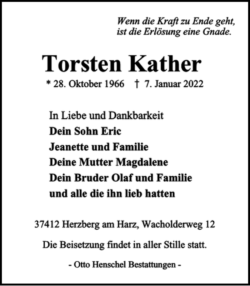 Hier finden Sie alle Traueranzeigen aus der Zeitung, die bisher für Torsten Kather erschienen sind. Weitere Traueranzeigen, die in der Zeitung erscheinen, werden hier ebenfalls aufgelistet