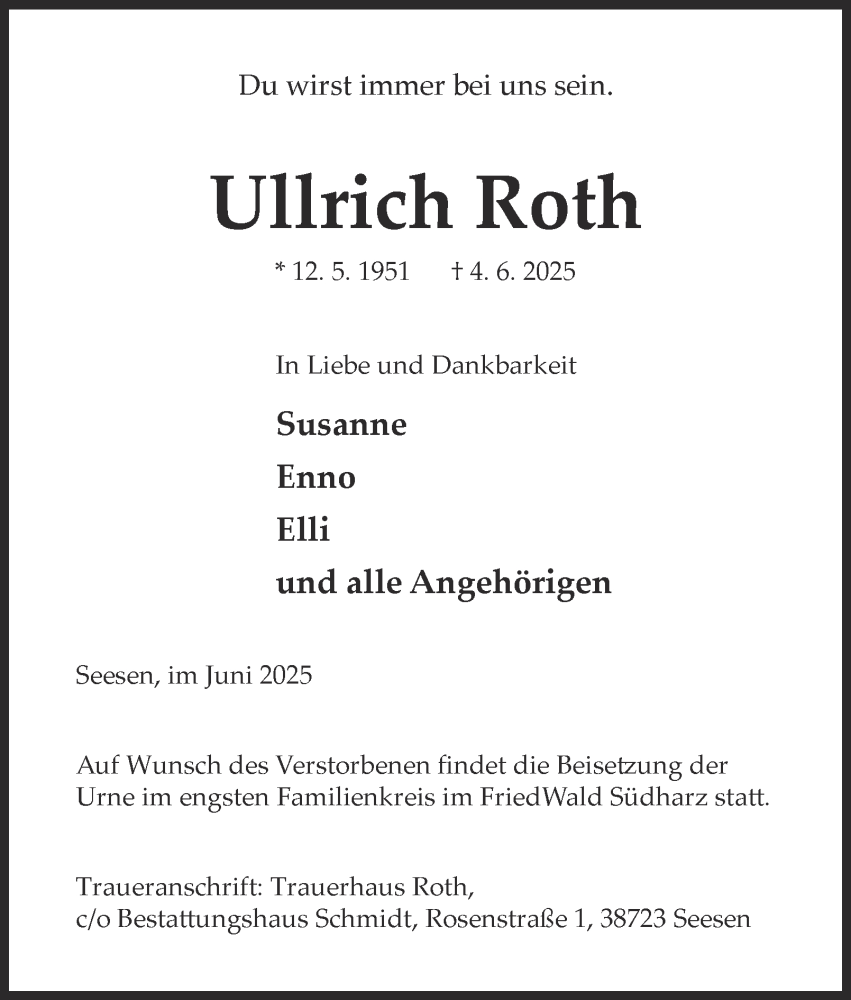Hier finden Sie alle Traueranzeigen aus der Zeitung, die bisher für Ullrich Roth erschienen sind. Weitere Traueranzeigen, die in der Zeitung erscheinen, werden hier ebenfalls aufgelistet