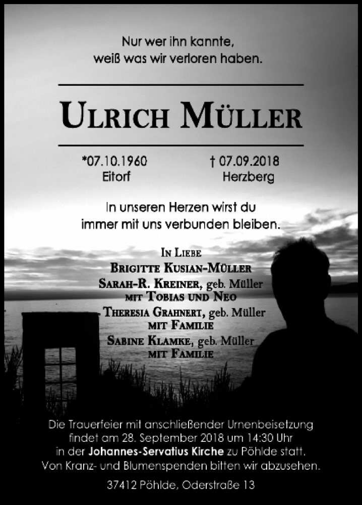 Hier finden Sie alle Traueranzeigen aus der Zeitung, die bisher für Ulrich Müller erschienen sind. Weitere Traueranzeigen, die in der Zeitung erscheinen, werden hier ebenfalls aufgelistet