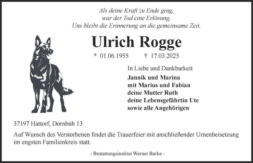 Hier finden Sie alle Traueranzeigen aus der Zeitung, die bisher für Ulrich Rogge erschienen sind. Weitere Traueranzeigen, die in der Zeitung erscheinen, werden hier ebenfalls aufgelistet