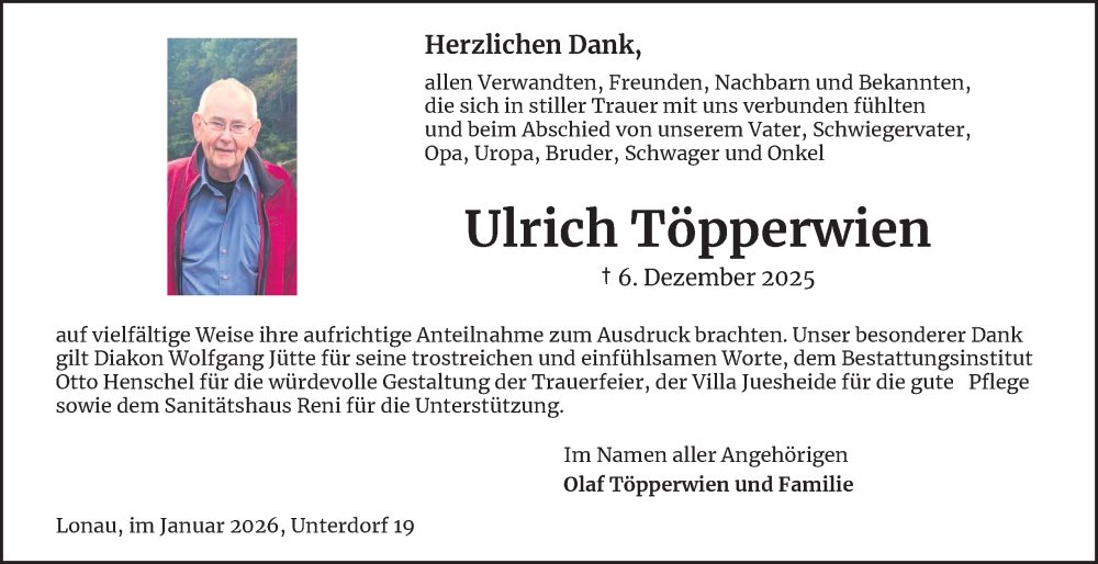 Hier finden Sie alle Traueranzeigen aus der Zeitung, die bisher für Ulrich Töpperwien erschienen sind. Weitere Traueranzeigen, die in der Zeitung erscheinen, werden hier ebenfalls aufgelistet