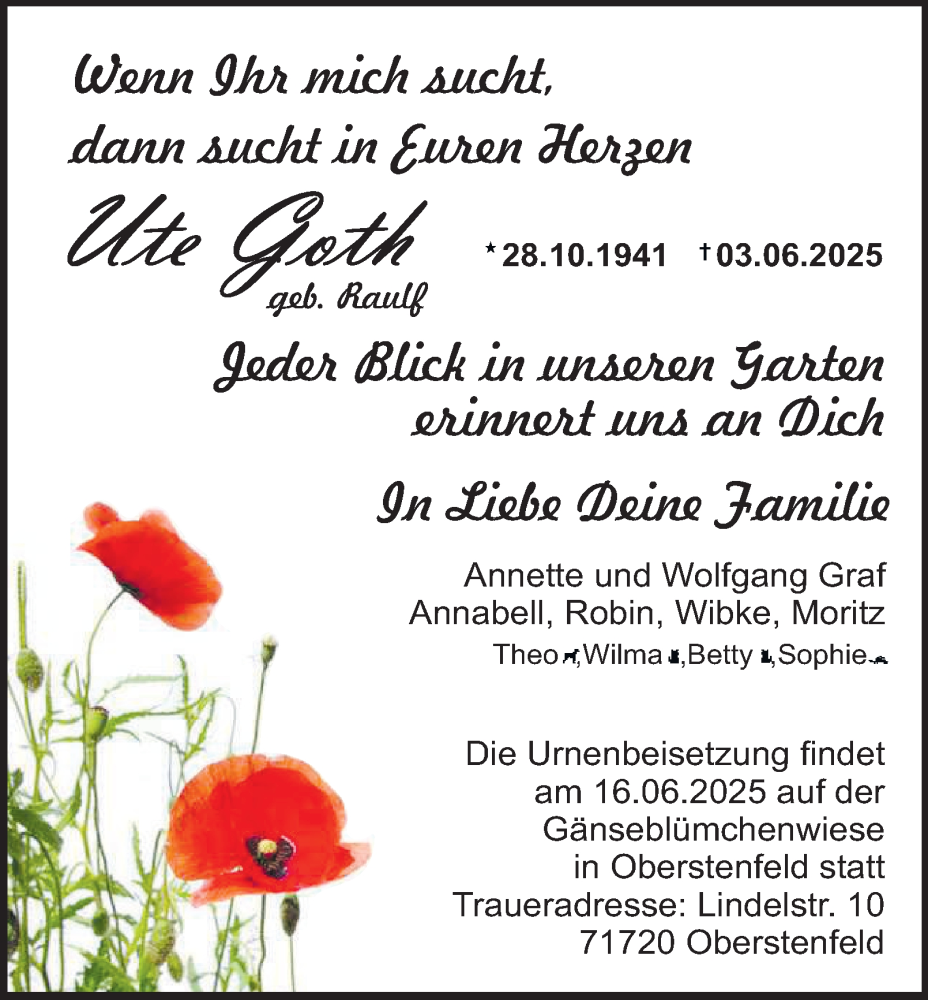 Hier finden Sie alle Traueranzeigen aus der Zeitung, die bisher für Ute Goth erschienen sind. Weitere Traueranzeigen, die in der Zeitung erscheinen, werden hier ebenfalls aufgelistet