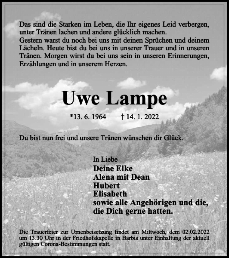 Hier finden Sie alle Traueranzeigen aus der Zeitung, die bisher für Uwe Lampe erschienen sind. Weitere Traueranzeigen, die in der Zeitung erscheinen, werden hier ebenfalls aufgelistet