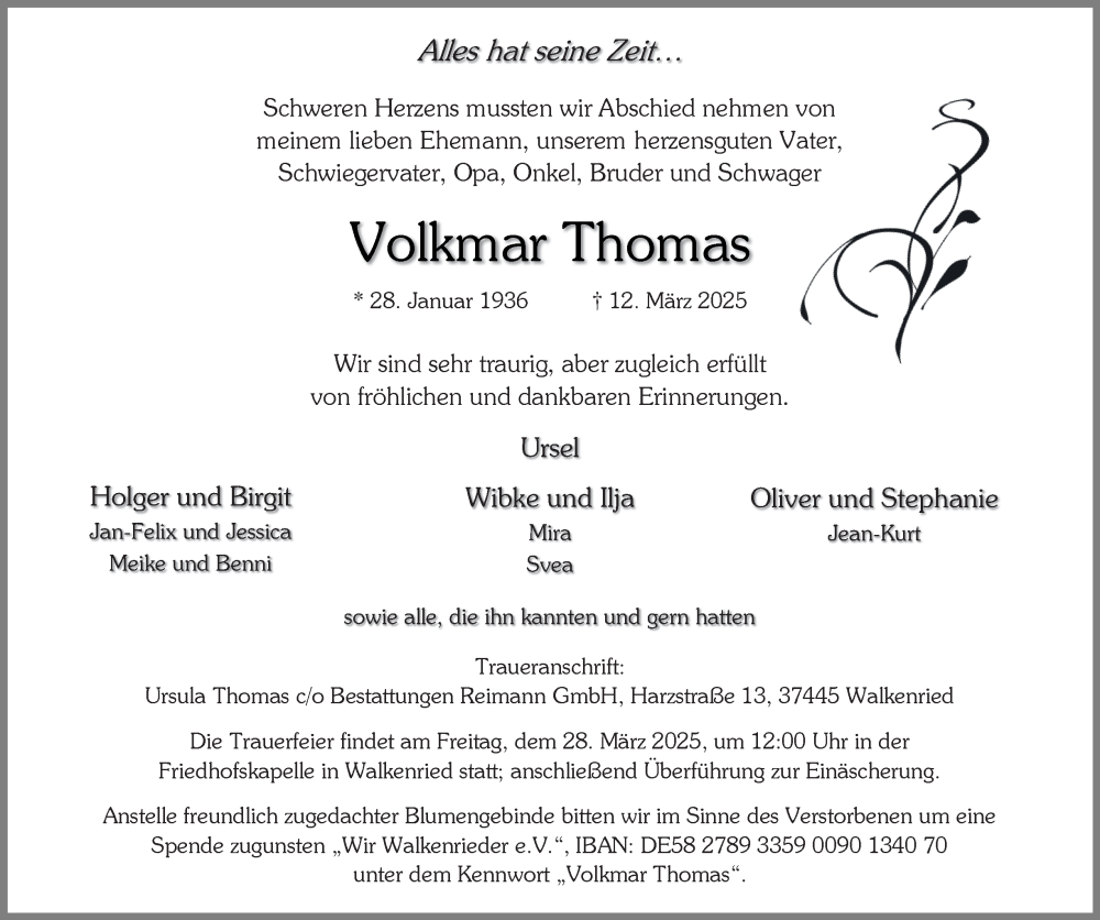 Hier finden Sie alle Traueranzeigen aus der Zeitung, die bisher für Volkmar Thomas erschienen sind. Weitere Traueranzeigen, die in der Zeitung erscheinen, werden hier ebenfalls aufgelistet