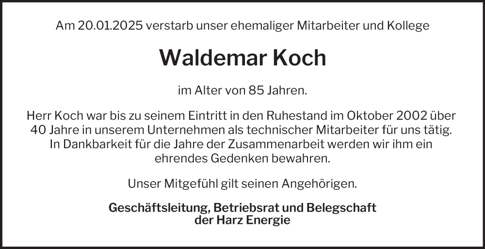 Hier finden Sie alle Traueranzeigen aus der Zeitung, die bisher für Waldemar Koch erschienen sind. Weitere Traueranzeigen, die in der Zeitung erscheinen, werden hier ebenfalls aufgelistet