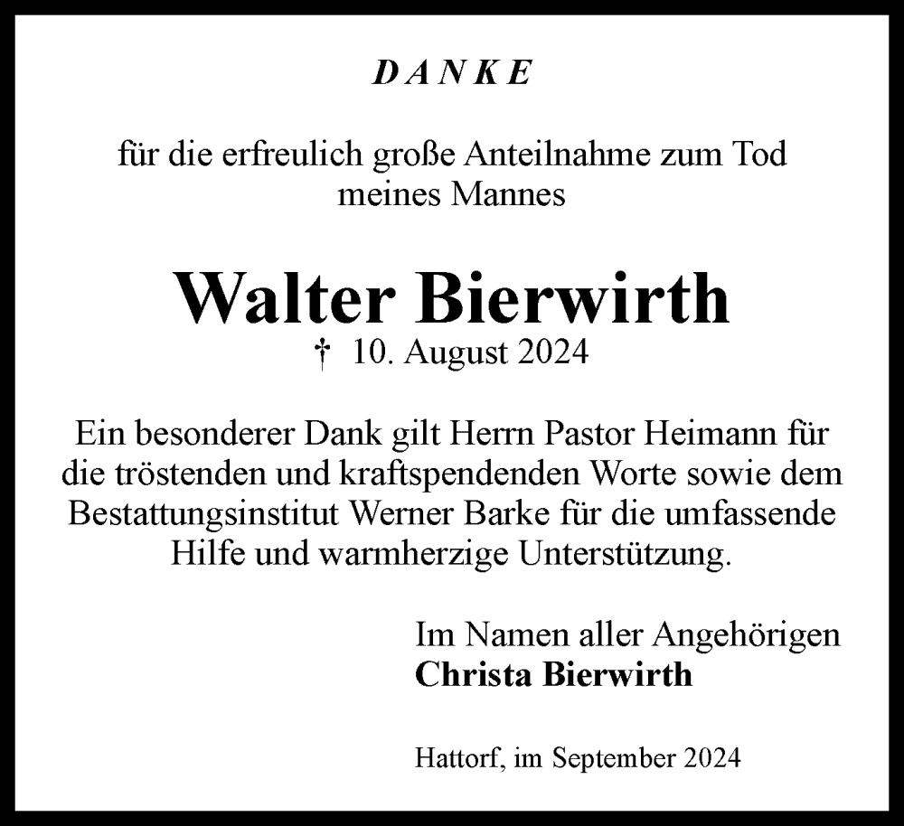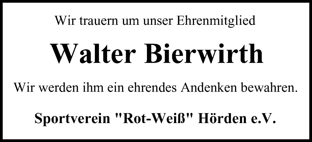 Hier finden Sie alle Traueranzeigen aus der Zeitung, die bisher für Walter Bierwirth erschienen sind. Weitere Traueranzeigen, die in der Zeitung erscheinen, werden hier ebenfalls aufgelistet