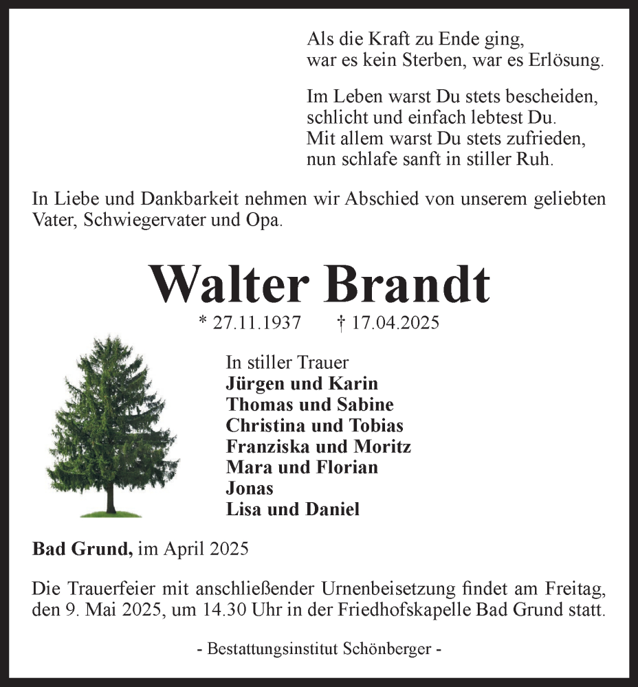 Hier finden Sie alle Traueranzeigen aus der Zeitung, die bisher für Walter Brandt erschienen sind. Weitere Traueranzeigen, die in der Zeitung erscheinen, werden hier ebenfalls aufgelistet