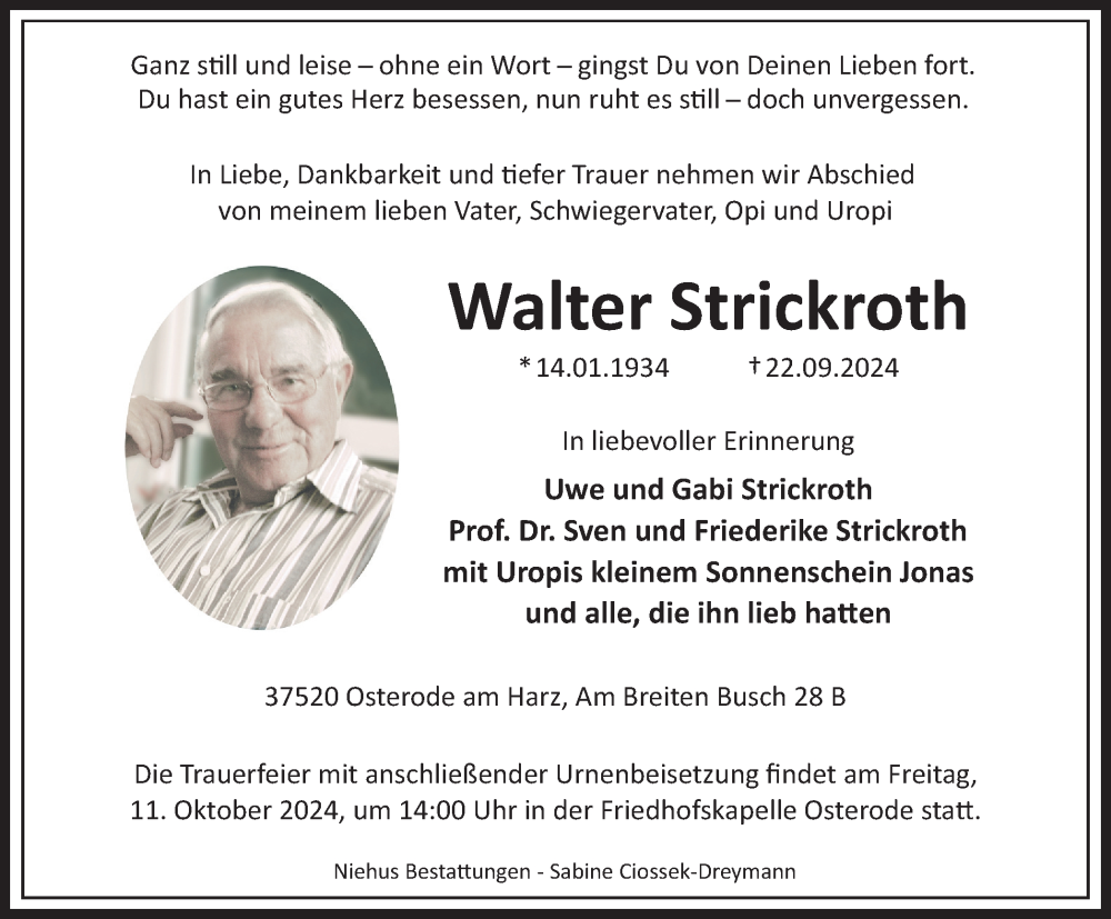 Hier finden Sie alle Traueranzeigen aus der Zeitung, die bisher für Walter Strickroth erschienen sind. Weitere Traueranzeigen, die in der Zeitung erscheinen, werden hier ebenfalls aufgelistet