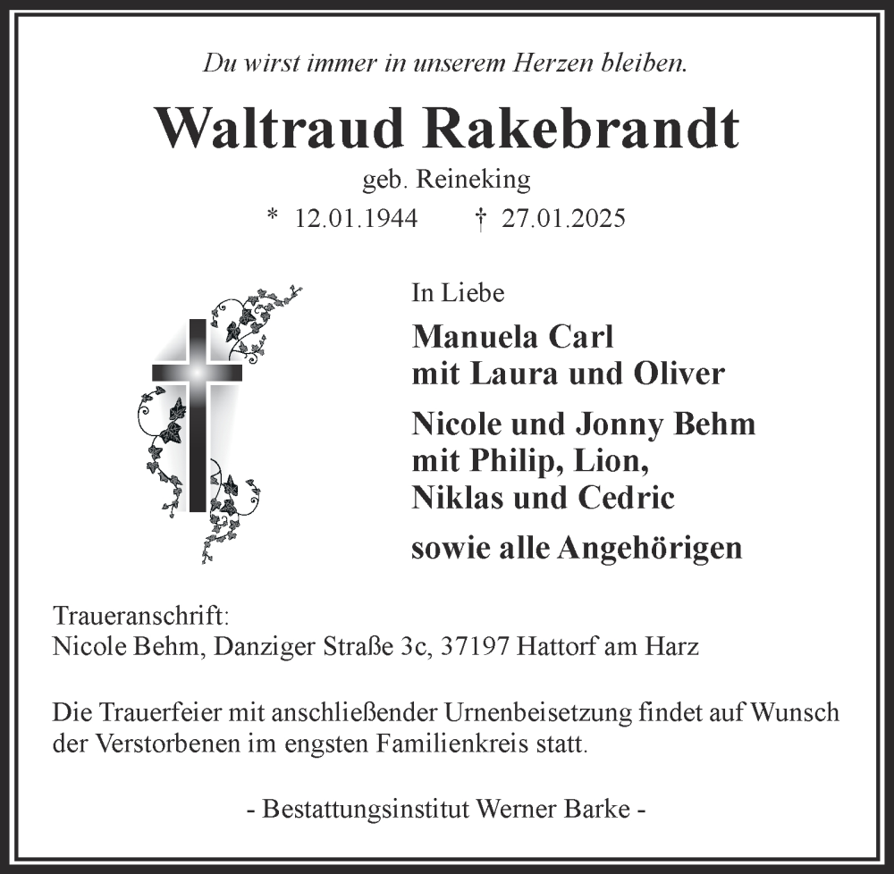 Hier finden Sie alle Traueranzeigen aus der Zeitung, die bisher für Waltraud Rakebrandt erschienen sind. Weitere Traueranzeigen, die in der Zeitung erscheinen, werden hier ebenfalls aufgelistet