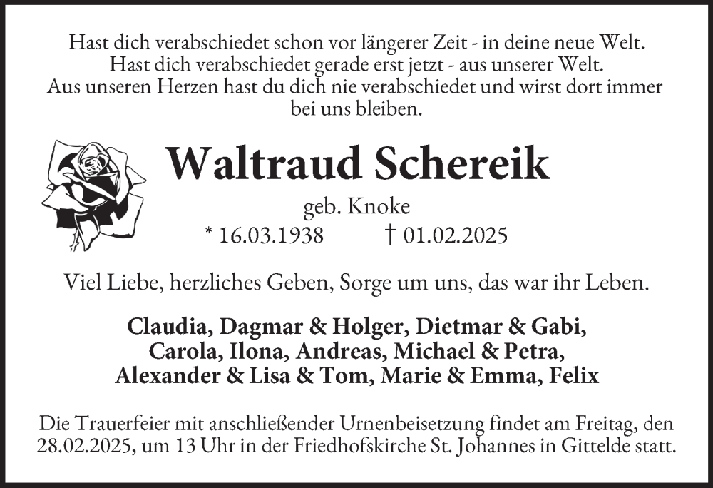 Hier finden Sie alle Traueranzeigen aus der Zeitung, die bisher für Waltraud Schereik erschienen sind. Weitere Traueranzeigen, die in der Zeitung erscheinen, werden hier ebenfalls aufgelistet