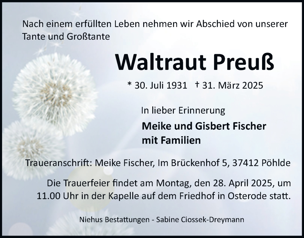 Hier finden Sie alle Traueranzeigen aus der Zeitung, die bisher für Waltraut Preuß erschienen sind. Weitere Traueranzeigen, die in der Zeitung erscheinen, werden hier ebenfalls aufgelistet