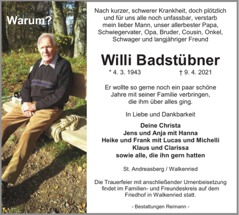 Hier finden Sie alle Traueranzeigen aus der Zeitung, die bisher für Willi Badstübner erschienen sind. Weitere Traueranzeigen, die in der Zeitung erscheinen, werden hier ebenfalls aufgelistet