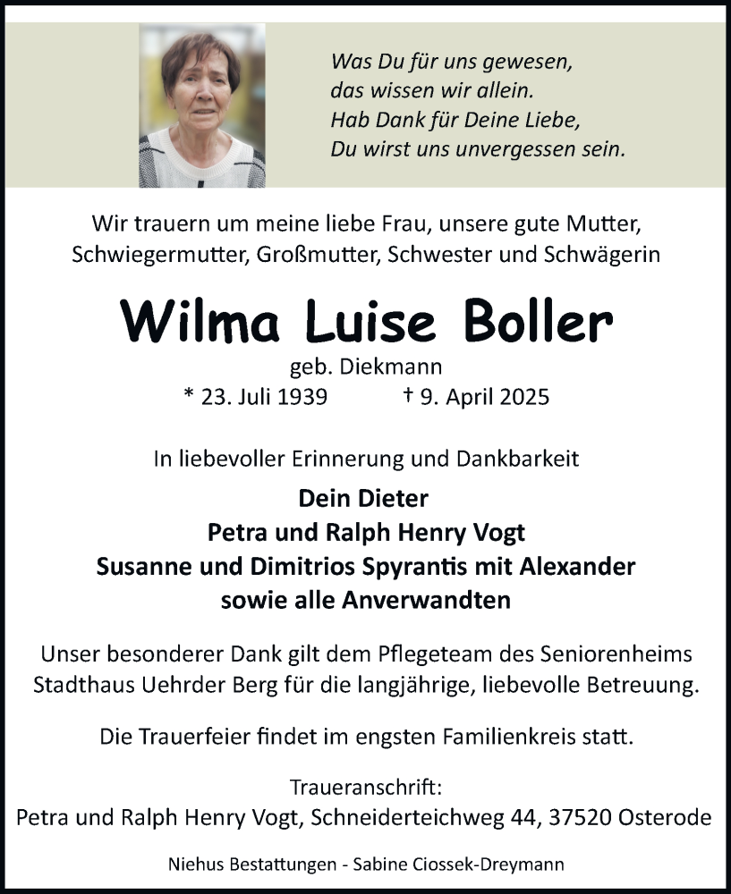 Hier finden Sie alle Traueranzeigen aus der Zeitung, die bisher für Wilma Luise Boller erschienen sind. Weitere Traueranzeigen, die in der Zeitung erscheinen, werden hier ebenfalls aufgelistet