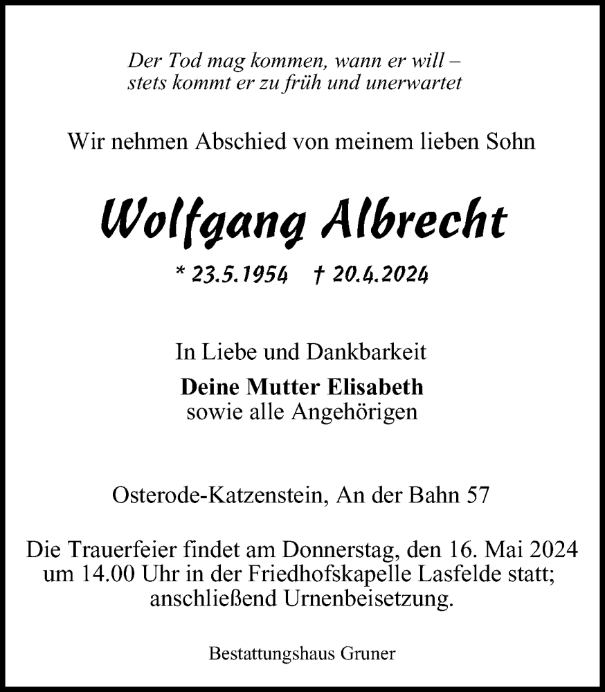 Hier finden Sie alle Traueranzeigen aus der Zeitung, die bisher für Wolfgang Albrecht erschienen sind. Weitere Traueranzeigen, die in der Zeitung erscheinen, werden hier ebenfalls aufgelistet
