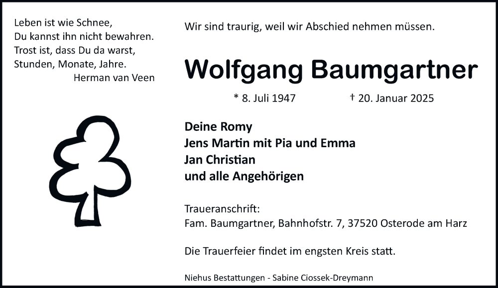 Hier finden Sie alle Traueranzeigen aus der Zeitung, die bisher für Wolfgang Baumgartner erschienen sind. Weitere Traueranzeigen, die in der Zeitung erscheinen, werden hier ebenfalls aufgelistet