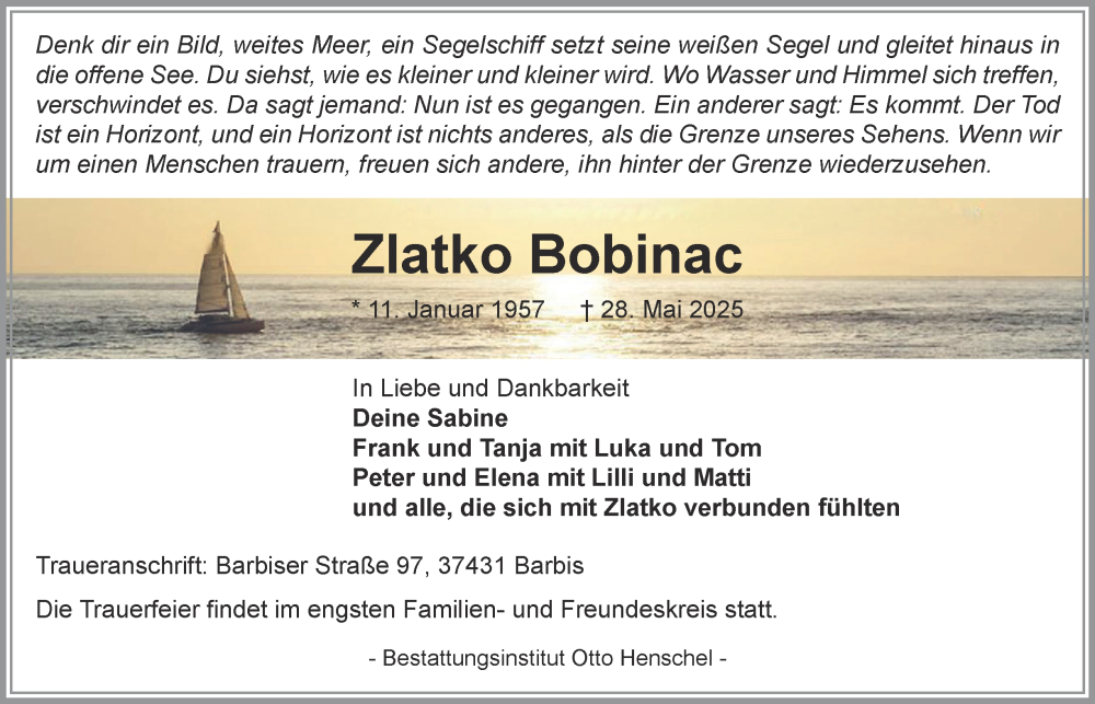 Hier finden Sie alle Traueranzeigen aus der Zeitung, die bisher für Zlatko Bobinac erschienen sind. Weitere Traueranzeigen, die in der Zeitung erscheinen, werden hier ebenfalls aufgelistet